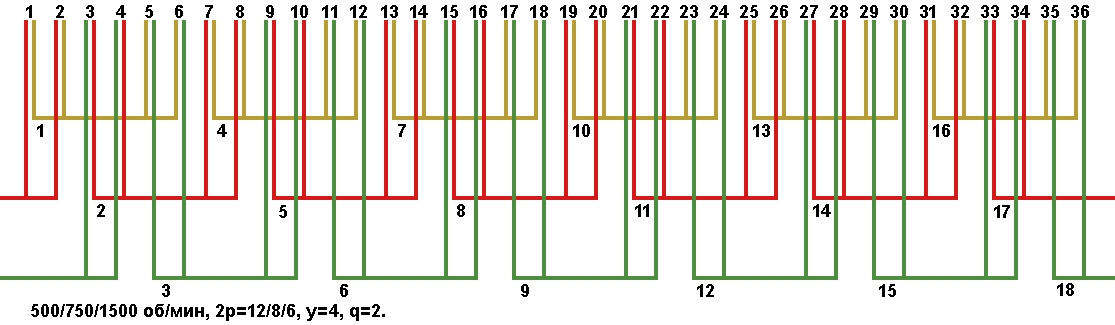 Схемы укладки трехскоростных обмоток. Z1=36, 2p=12/8/6, 500/750/1500 об/мин.