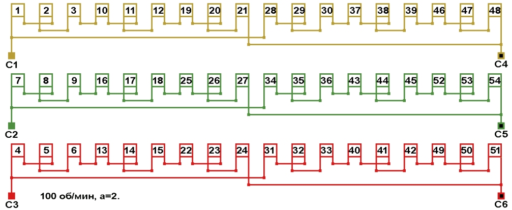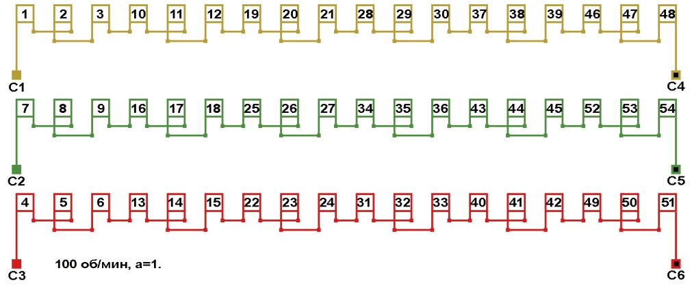 | Начало фаз по пазам | C1;C2;C3 | 1;7;4 |