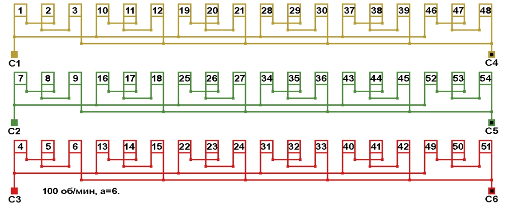 Схема соединений обмотки, количество параллельных ветвей а=6.