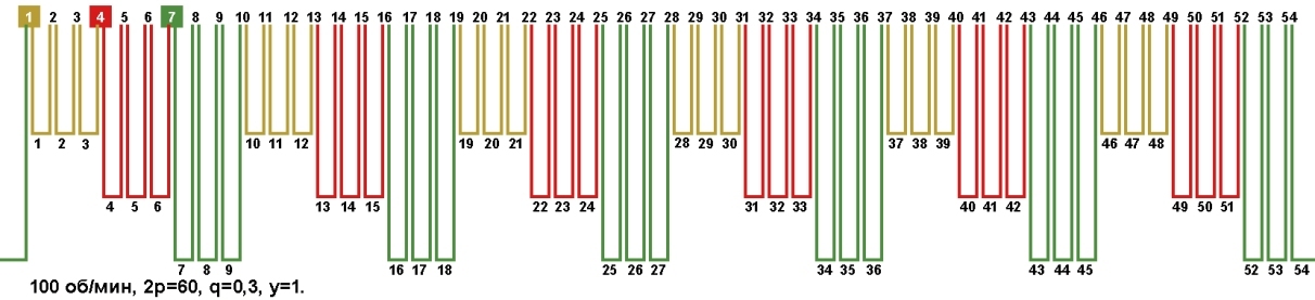 Схемы обмоток синхронных электродвигателей на постоянных магнитах, с количеством пазов 54, 2p=60 100 об/мин.