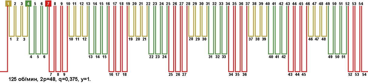 Схема укладки обмоток электродвигателей с количеством пазов 54, 2p=48 125 об/мин.