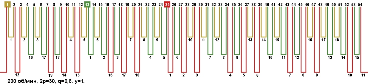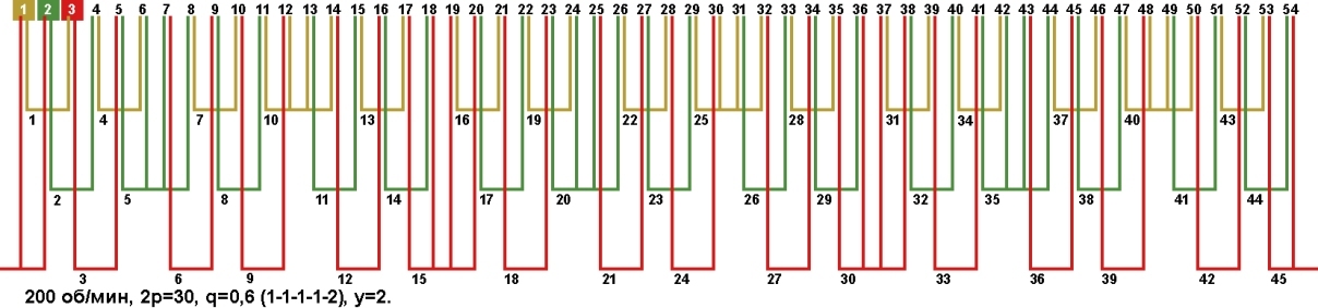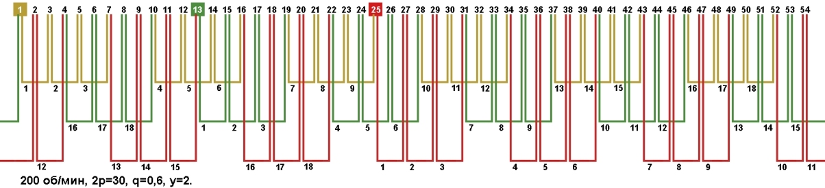 Схема укладки обмотки электродвигателя с количеством пазов 54, 2p=30 200 об/мин.