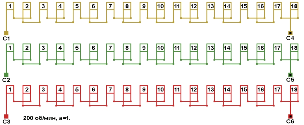 | Начало фаз по пазам | C1;C2;C3 | 1;2;3 |