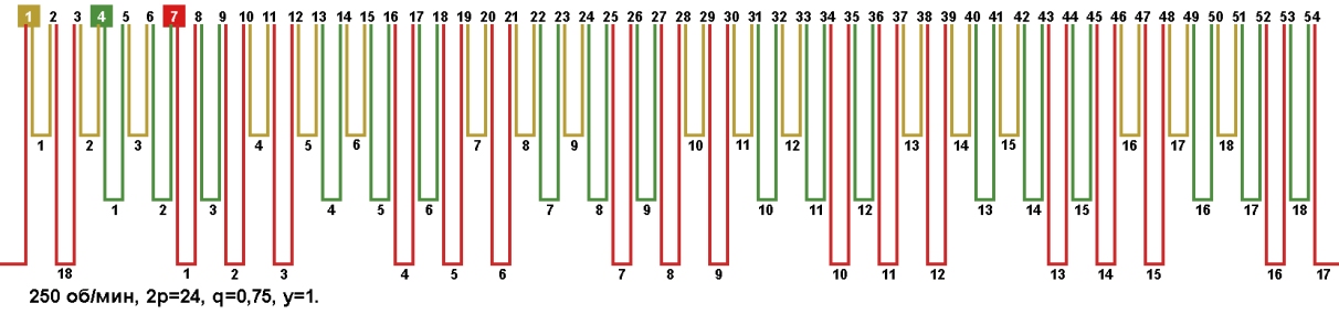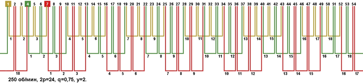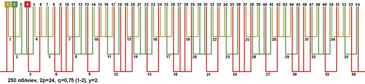 Схемы укладки обмоток электродвигателей с количеством пазов 54, 2p=24 250 об/мин.
