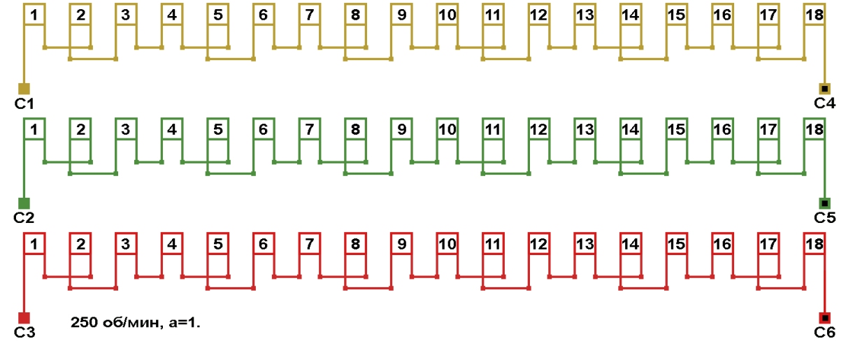 | Начало фаз по пазам | C1;C2;C3 | 1;2;4 |