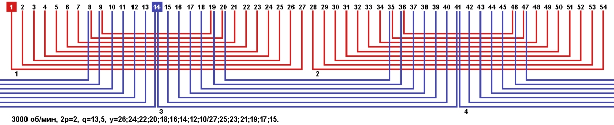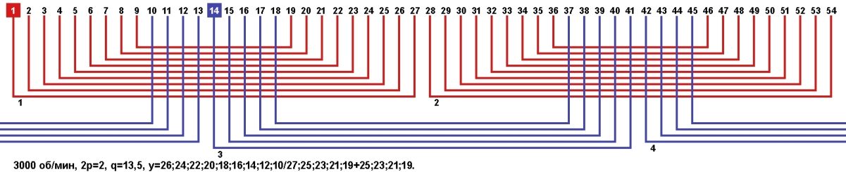 Схема укладки обмотки однофазного электродвигателя с количеством пазов 54, 2p=2 3000 об/мин.