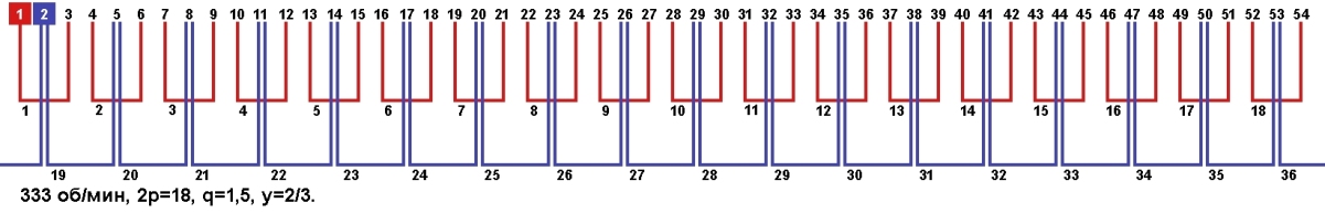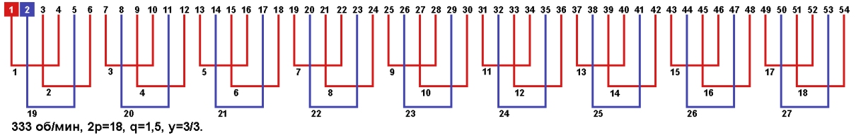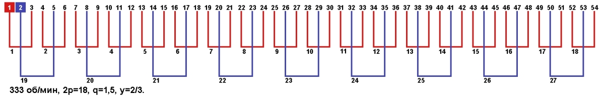 Схема укладки обмотки однофазного электродвигателя с количеством пазов 54, 2p=18 333 об/мин.