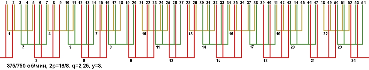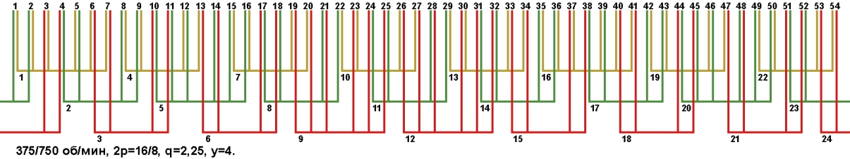 Схемы укладки двухскоростных обмоток. Z1=54, 2p=16/8, 375/750 об/мин.