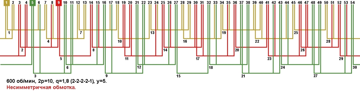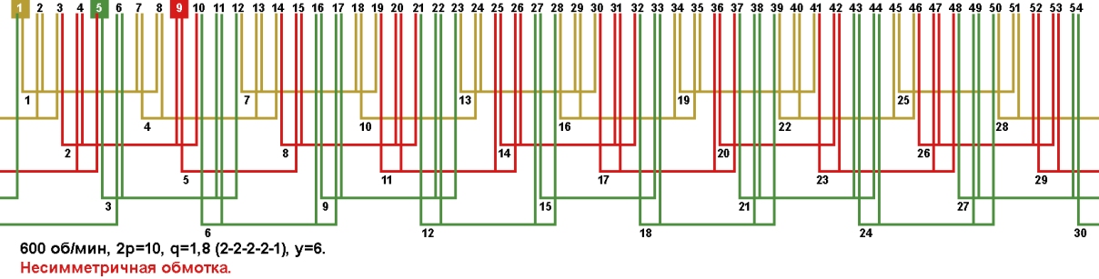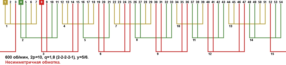 Схемы укладки несимметричных обмоток электродвигателей с количеством пазов 54, 2p=10 600 об/мин.