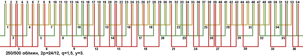 Схема укладки двухскоростной обмотки. Z1=54, 2p=24/12, 250/500 об/мин., q=1,5, шаг у=3, параллельных ветвей а=1, а=3.