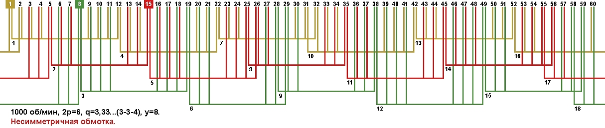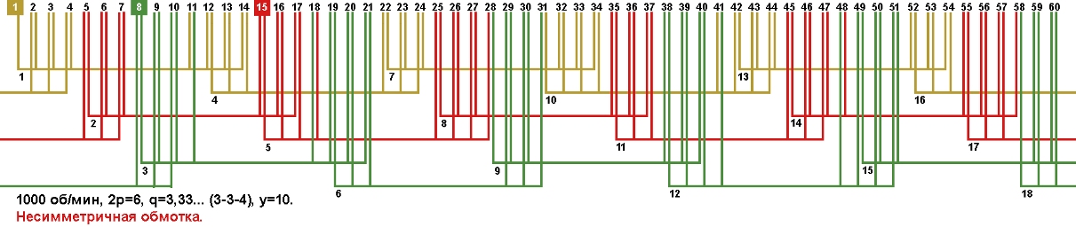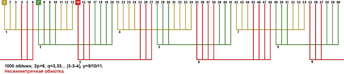 Схемы укладки обмоток электродвигателей с количеством пазов 60, 2p=6 1000 об/мин.