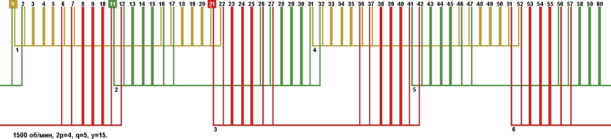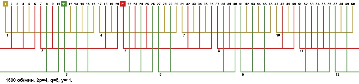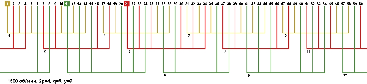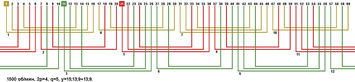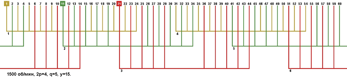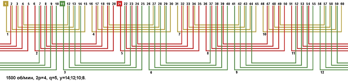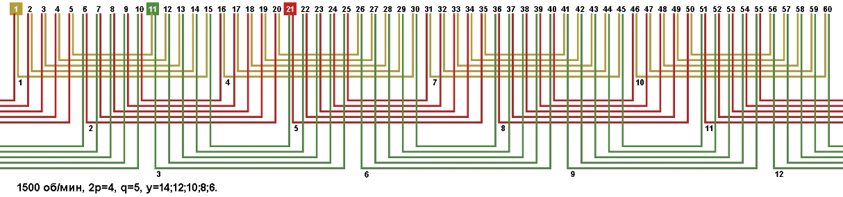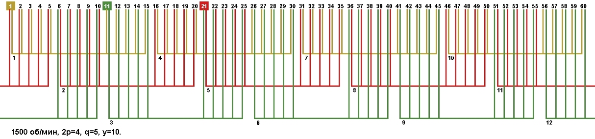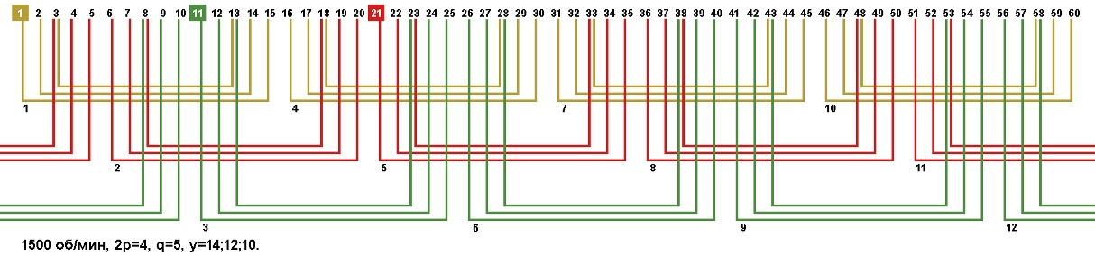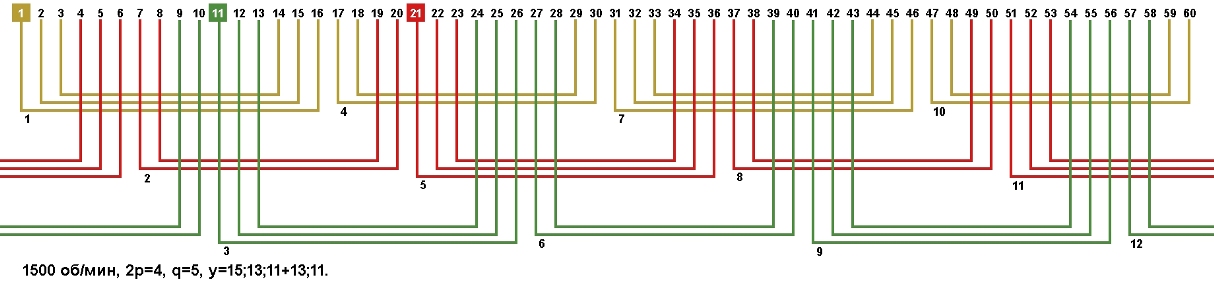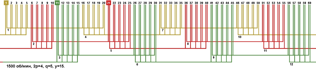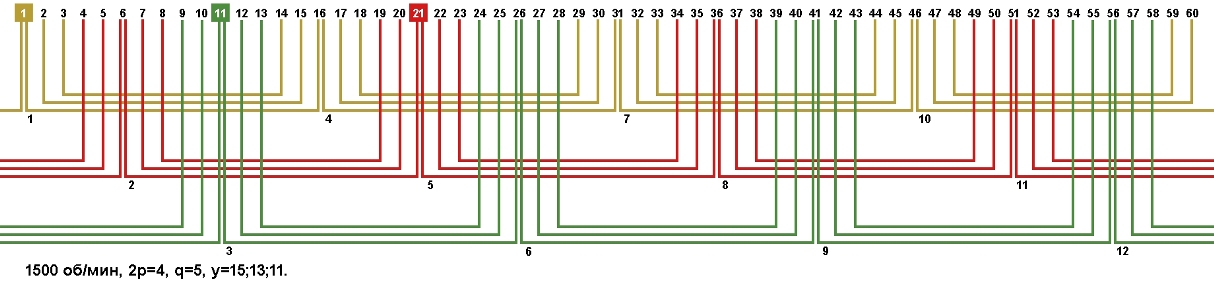 Схемы укладки обмоток электродвигателей с количеством пазов 60, 2p=4 1500 об/мин.