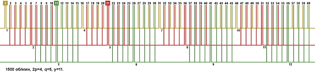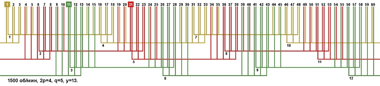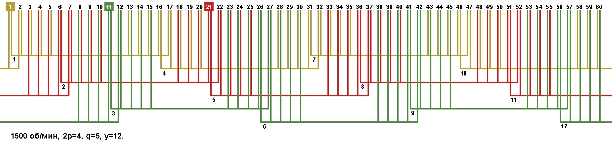 | Начало фаз по пазам | C1;C2;C3 | 1;11;21 |