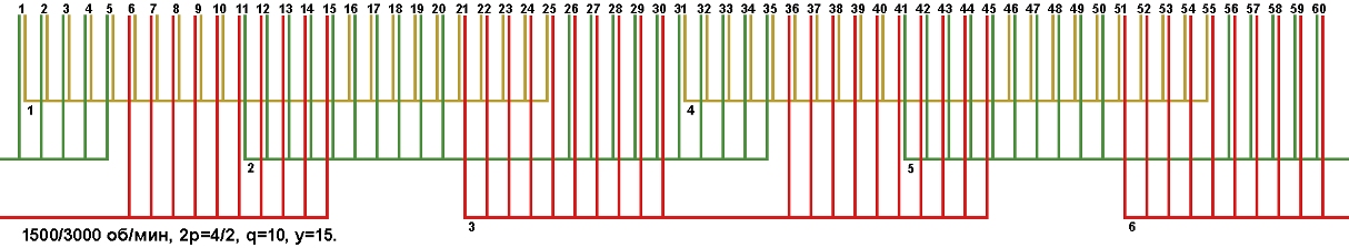 Схема укладки двухскоростной обмотки. Z1=60, 2p=4/2, 1500/3000 об/мин., q=10, шаг у=15, соединение фаз Δ/YY и Y/YY, а=1/2.