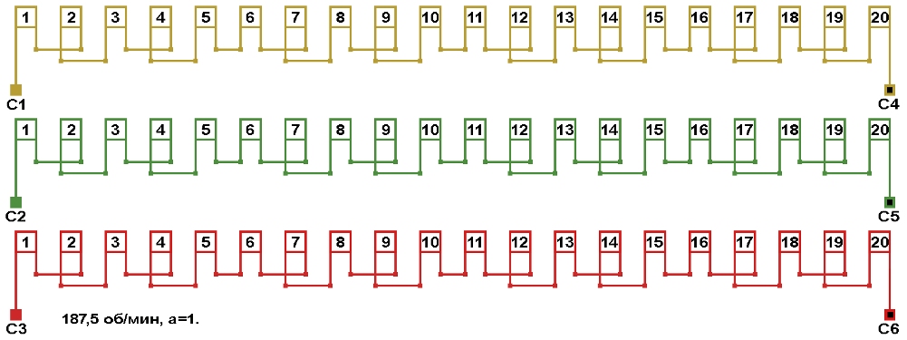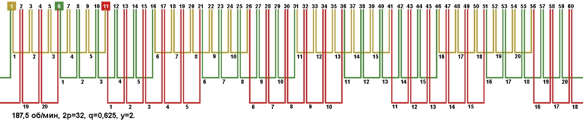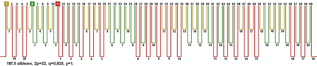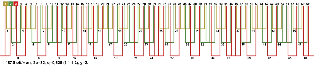 Схема укладки обмотки электродвигателя с количеством пазов 60, 2p=32 187,5 об/мин.