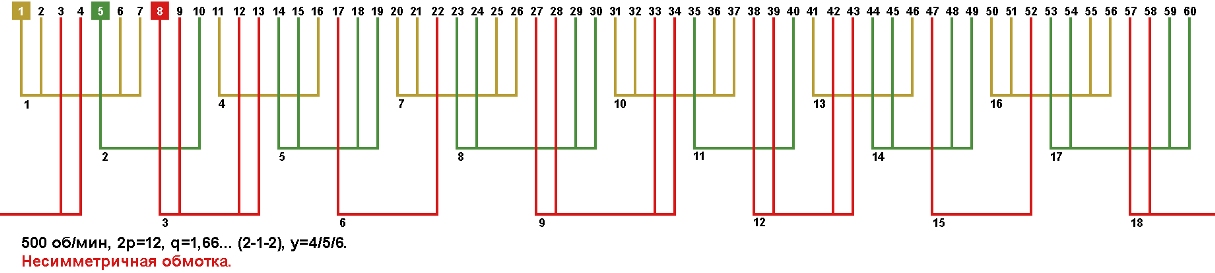 | Начало фаз по пазам | C1;C2;C3 | 1;5;8 несимметричная обмотка |