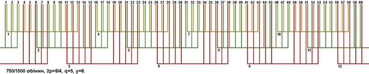 Схема укладки двухскоростной обмотки. Z1=60, 2p=8/4, 750/1500 об/мин., q=5, шаг у=8, параллельных ветвей а=1, а=2.