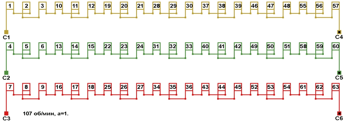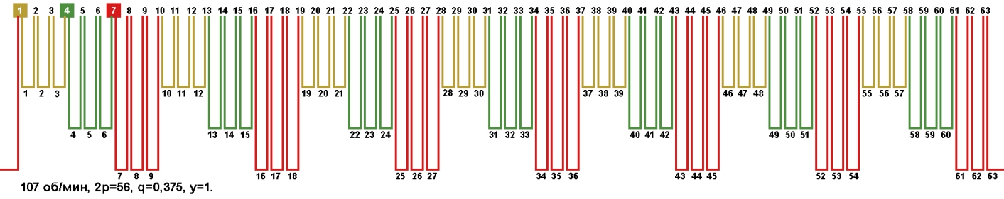 Схема укладки обмоток электродвигателей с количеством пазов 63, 2p=56 107 об/мин.