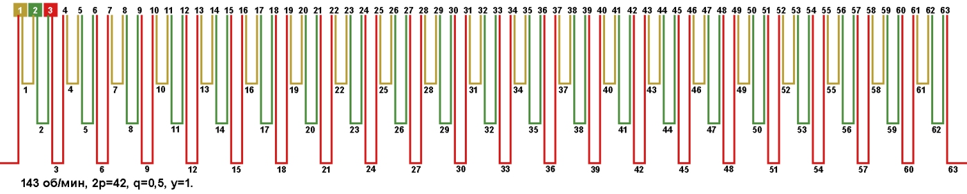 Схема укладки обмотки электродвигателя с количеством пазов 63, 2p=42 143 об/мин.