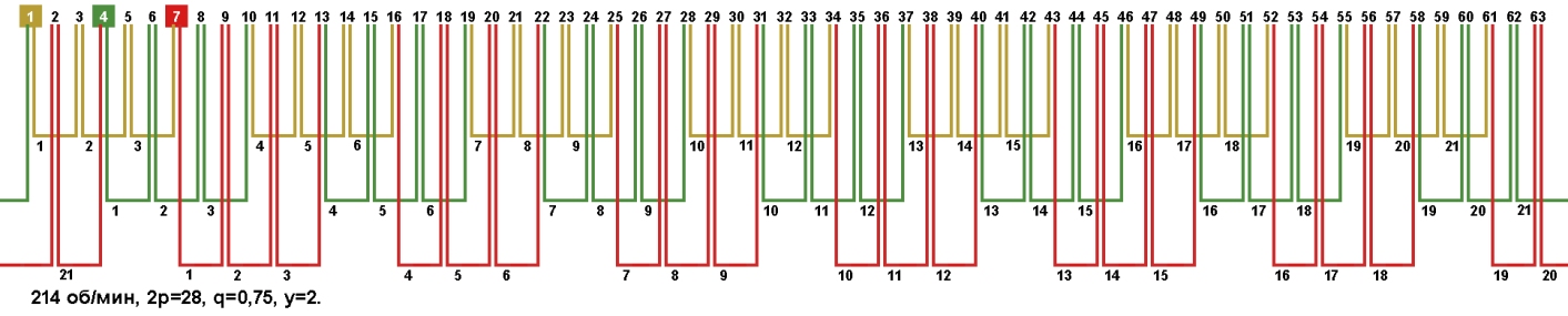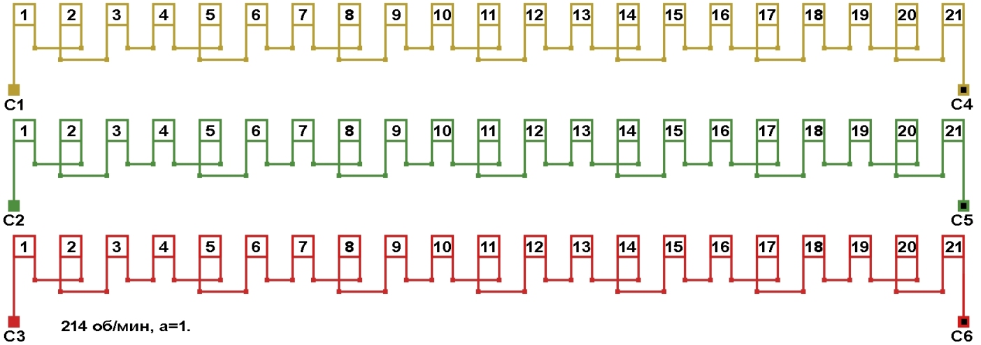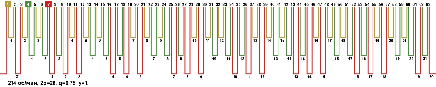 Схема укладки обмотки электродвигателя с количеством пазов 63, 2p=28 214 об/мин.