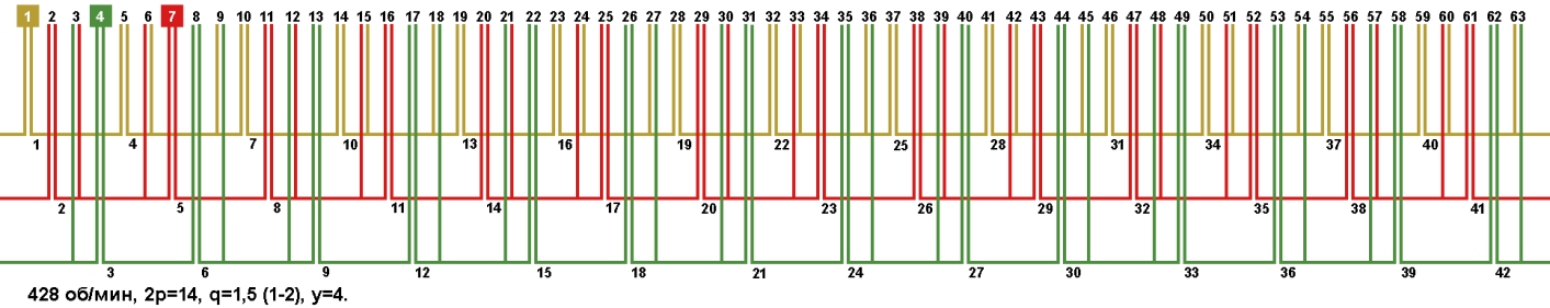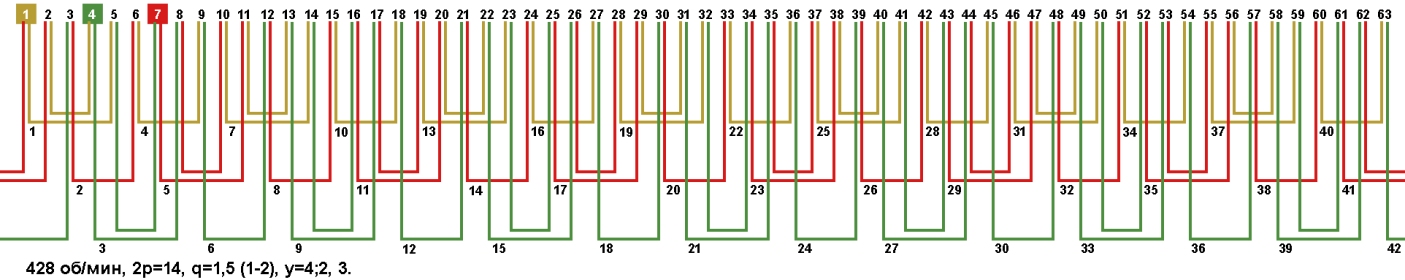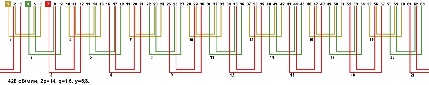 Схемы укладки обмоток электродвигателей с количеством пазов 63, 2p=14 428 об/мин.