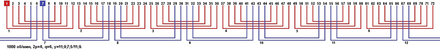 Схемы укладки обмоток однофазных электродвигателей с количеством пазов 72, 2p=6 1000 об/мин.