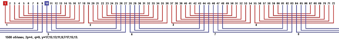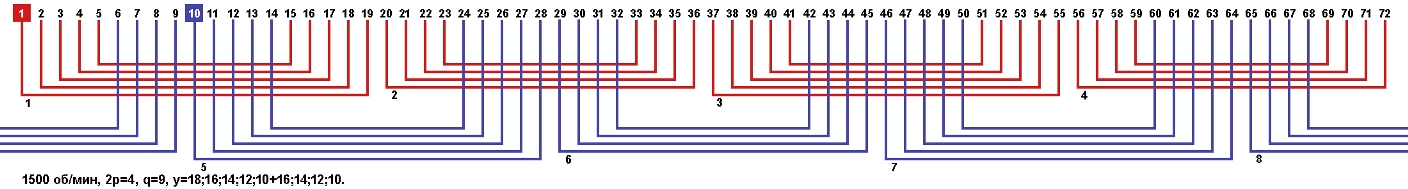 Схемы укладки обмоток однофазных электродвигателей с количеством пазов 72, 2p=4 1500 об/мин.