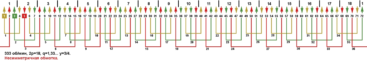 Схемы укладки обмоток электродвигателей с количеством пазов 72, 2p=18 333 об/мин.