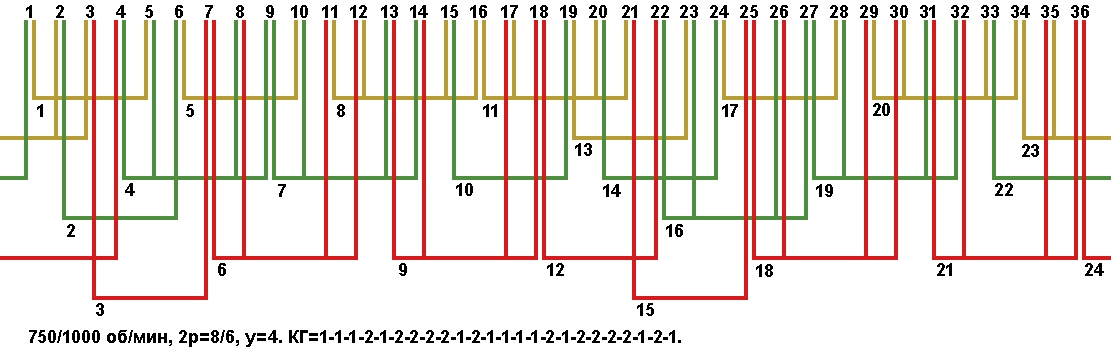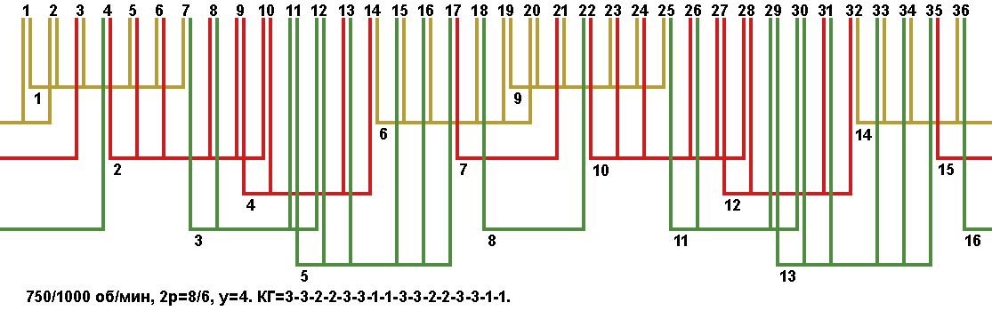 Схемы укладки двухскоростных обмоток. Z1=36, 2p=8/6, 750/1000 об/мин.