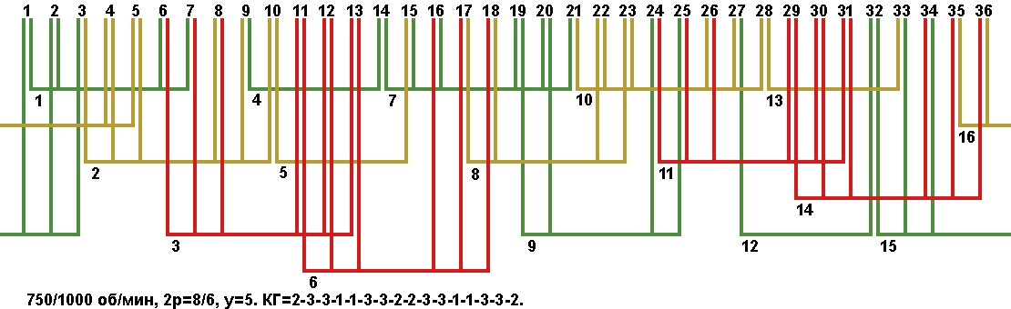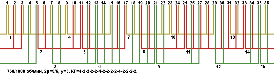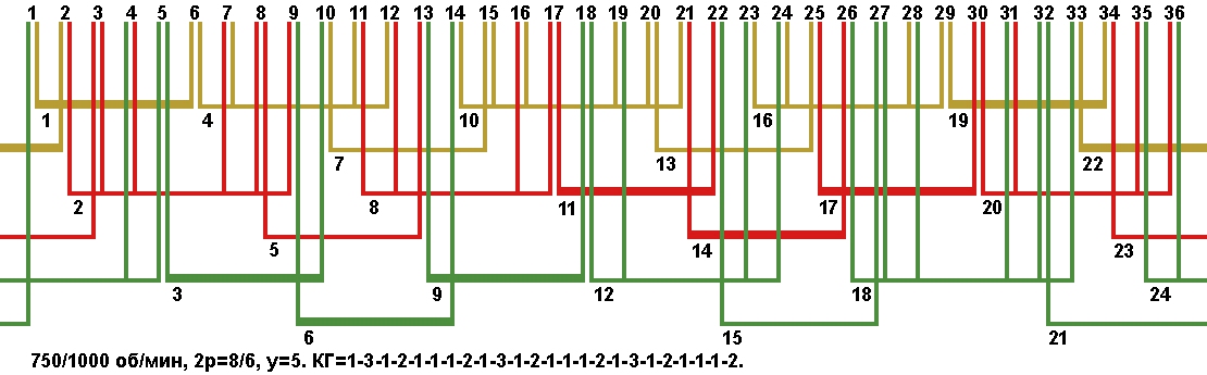 Схема укладки двухскоростной обмотки. Z1=36, 2p=8/6, 750/1000 об/мин., шаг у=5, соединение фаз YYY/YYY, а=3.