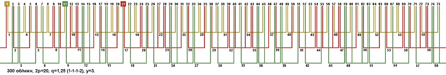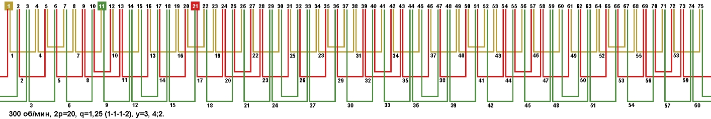 Схема укладки обмотки электродвигателя с количеством пазов 75, 2p=20 300 об/мин.