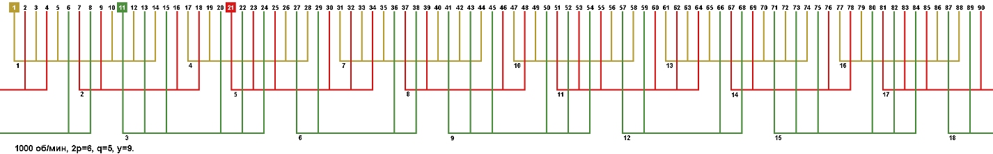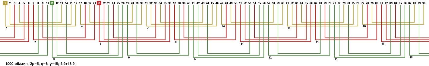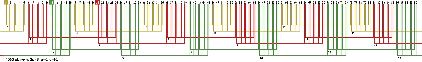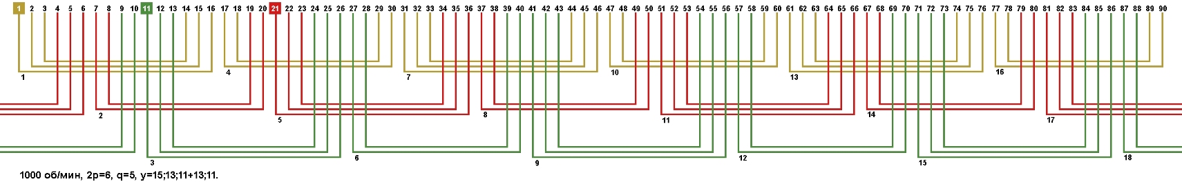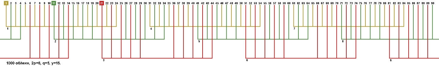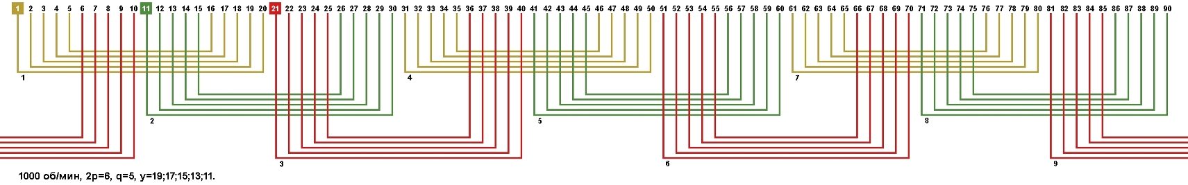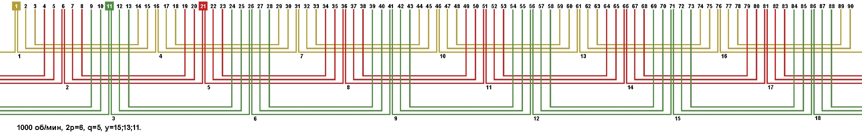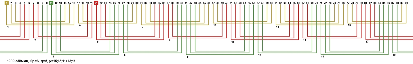 Схемы укладки обмоток электродвигателей с количеством пазов 90, 2p=6 1000 об/мин.