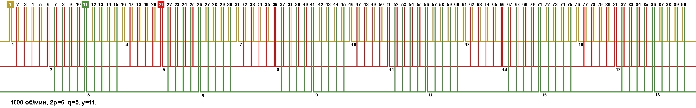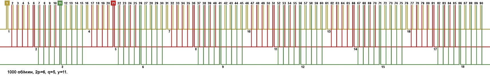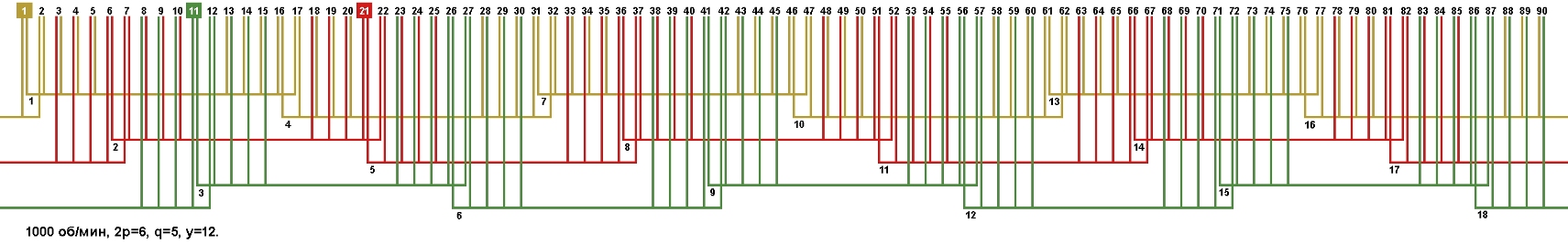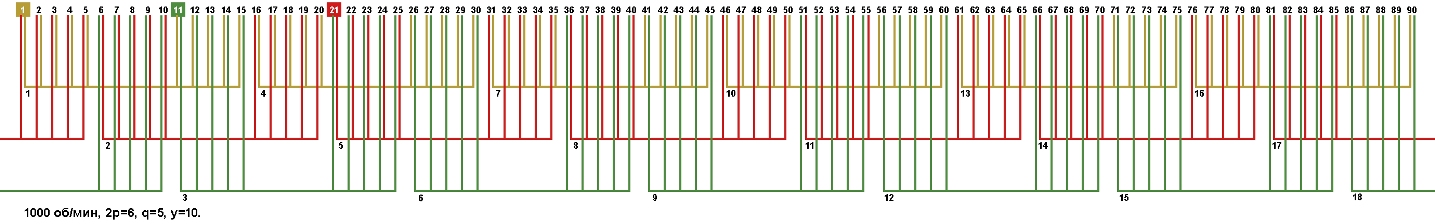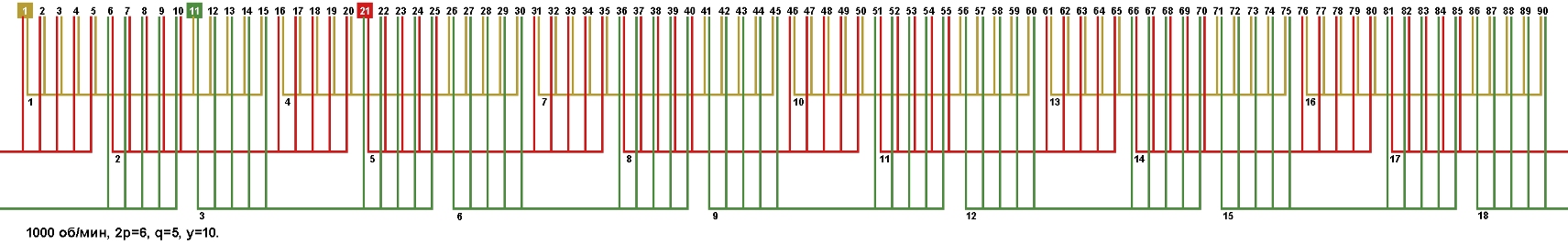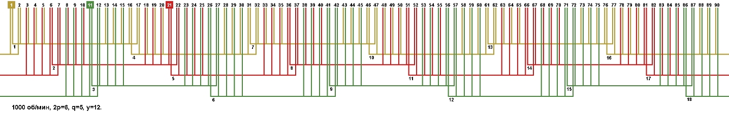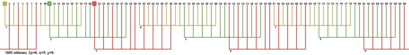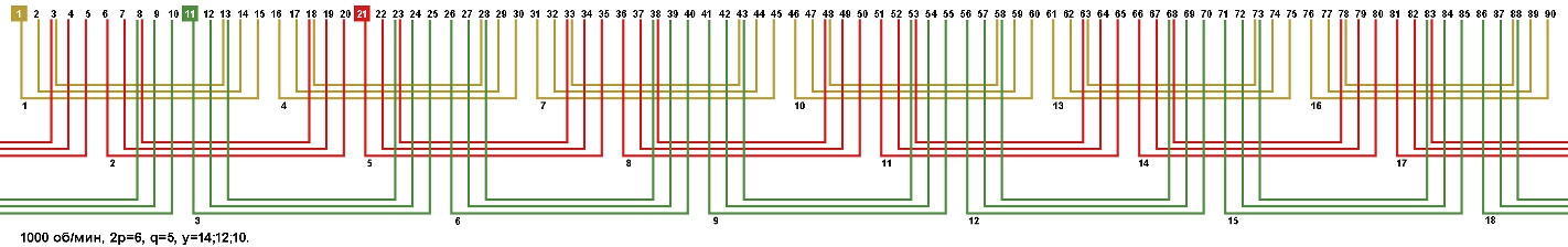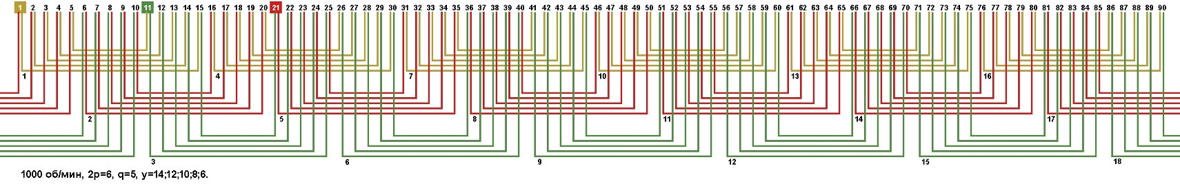Схемы укладки обмоток электродвигателей с количеством пазов 90, 2p=6 1000 об/мин.