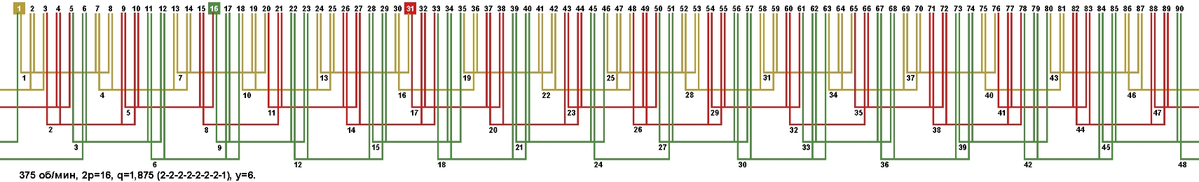 Схема укладки обмотки электродвигателя с количеством пазов 90, 2p=16 375 об/мин.